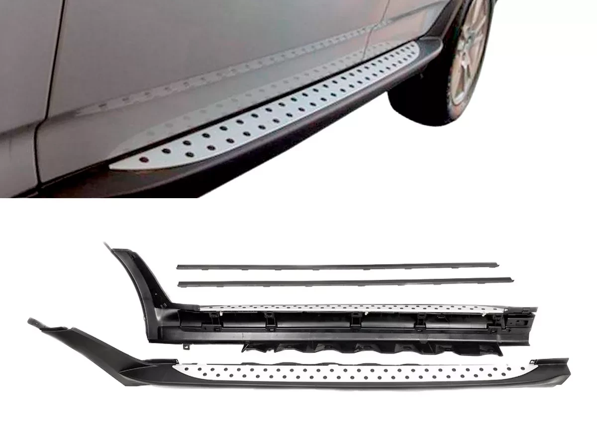 - Подножки защищают автомобиль от боковых повреждений, особенно на парковках, когда открывают двери стоящие поблизости автомобили. Помимо этого они полезны при входе/выходе в автомобиль, обеспечивают комфортное рабочее положение размещения багажа на крыше. Для уменьшения риска поскользнуться, на поверхности интегрированы прорезиненные вставки против скольжения.