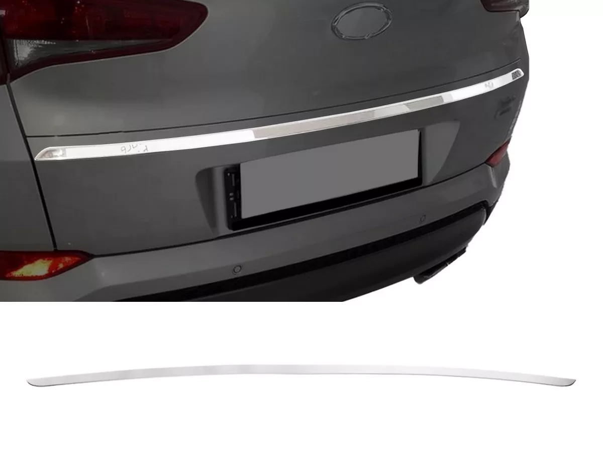 - Длинная хром накладка Carmos над номером задней двери Hyundai Tucson III (TL; 2016-2018).