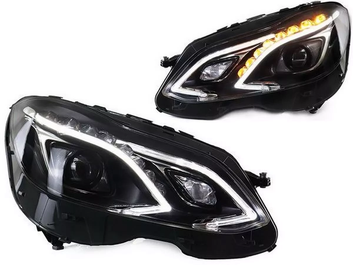 Чёрные фары полностью диодные линзовые с дневными ходовыми огнями предназначены для замены ламповых фар (с лампочкой H7) MERCEDES E-Class W212 (2013-2016) после рестайлинга. Не подходят для моделей с оригинальными диодными фарами и функцией AFS!