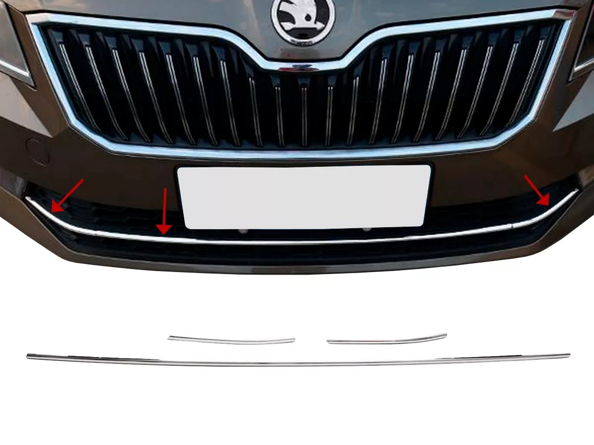- Хром накладки Omsa Line полоской на передний бампер Skoda Superb III (3V; 2015-2018) к рестайлингу.