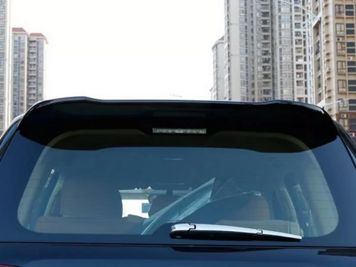 Черный верхний спойлер без стоп-сигнала над стеклом задней двери Toyota Land Cruiser 200 (2016-2021). Разработан для того, чтобы отметить спортивный характер, сохраняя при этом элегантные линии корпуса автомобиля. Улучшает управляемость, особенно на высоких скоростях.