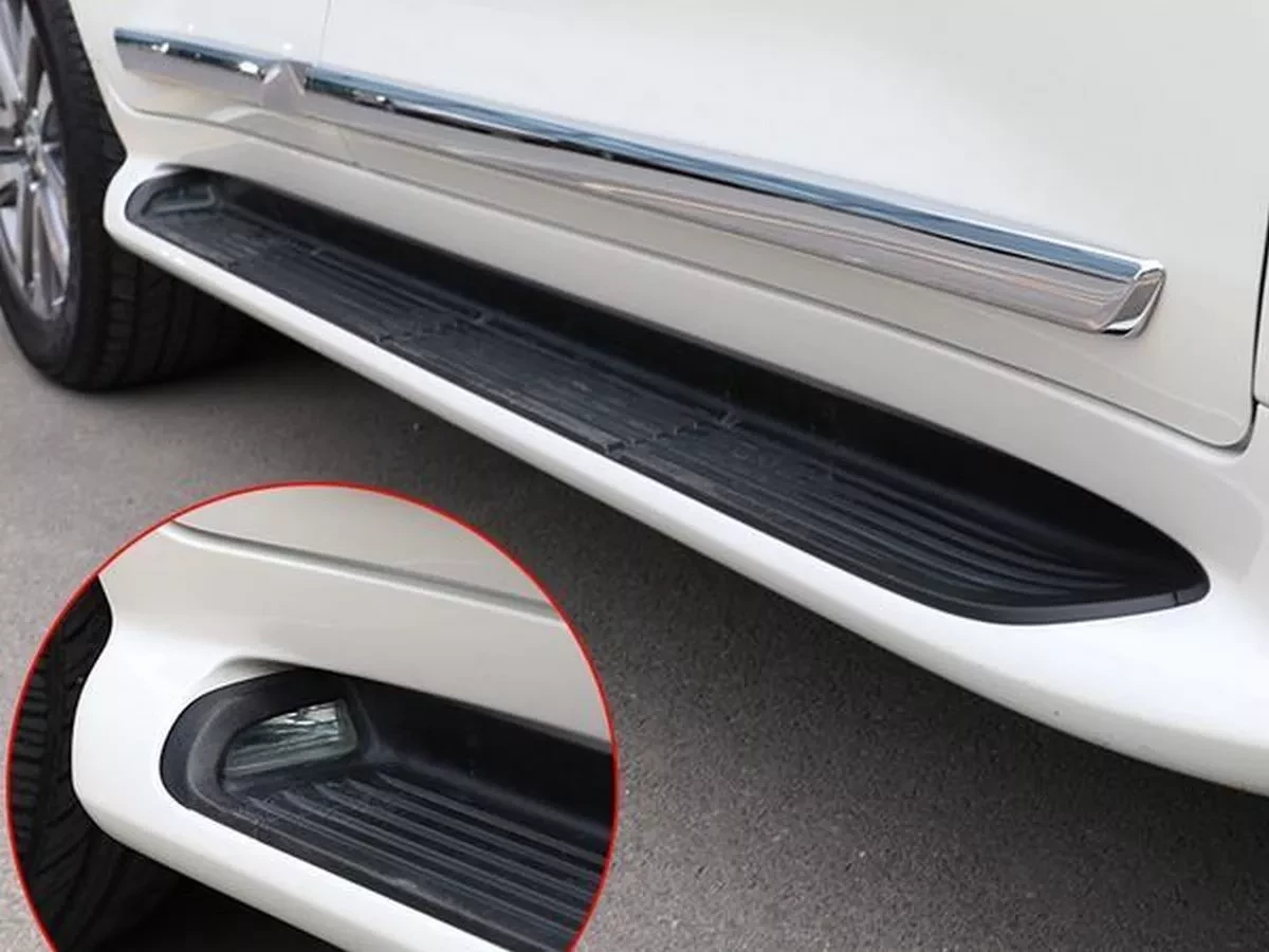 - Белые пороги боковые в стиле 2016 года с LED подсветкой для Toyota Land Cruiser 200 (2007-2021).