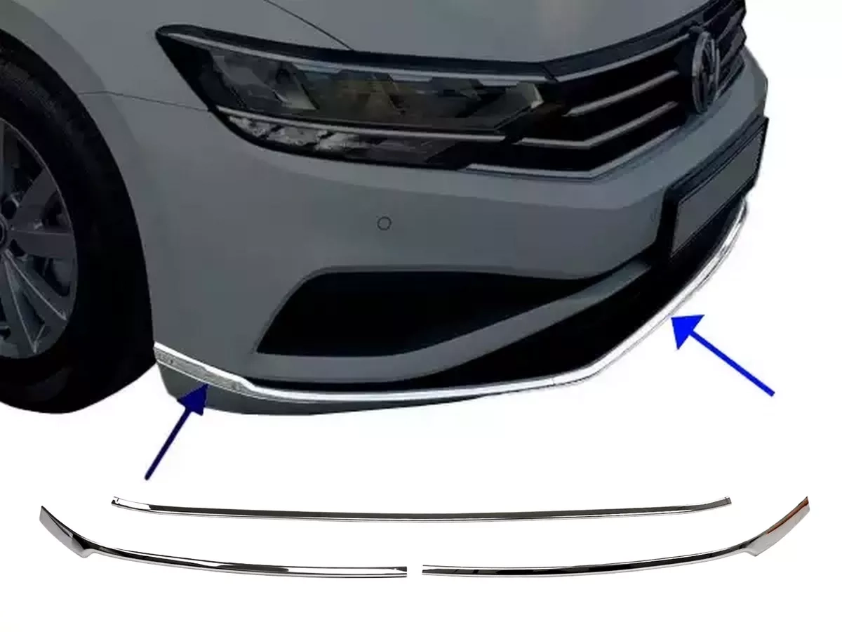 - Хром молдинг Omsa Line внизу переднього бампера VW Passat B8.5 (2019-2022) Sedan, Variant після рестайлінгу.